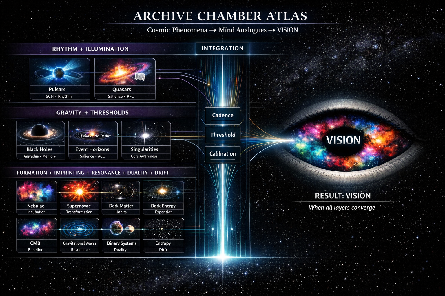 So the Archive Chamber Atlas treats each cosmic phenomenon as a cinematic mirror. On one side, the sky. On the other, the mind. And in the middle, the machinery, brain regions and networks that make the analogy feel real.